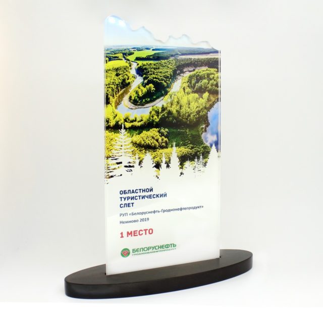 Стелла займёт заслуженное место в кабинете или в доме работника. Весомая награда для победителей имеет лаконичную форму и оригинальный дизайн. На тонком оргстекле изображены красоты принеманского края. Она долго будет радовать победителей, напоминая о времени, проведённом в кругу коллег.