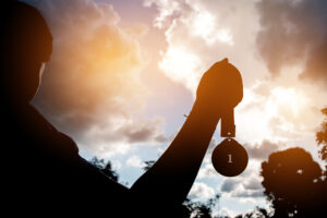 Blurred of silhouette busunesswoman hands raised and holding gol