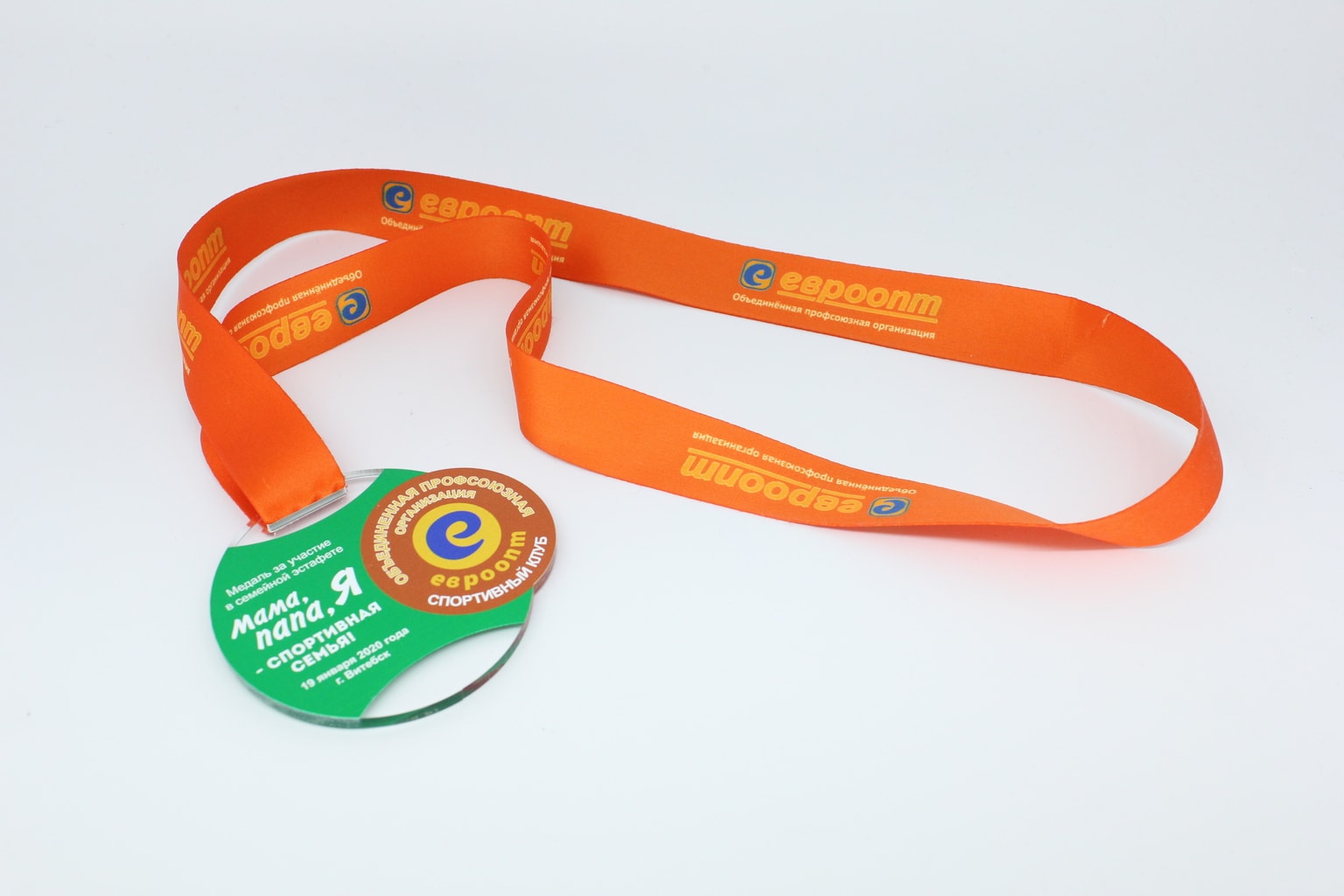 Медаль оригинальной формы. Материал основы – оргстекло 6 мм., сверху – полноцветная картинка нанесена способом УФ печати. Фирменный ланъярд делает медаль оригинальным корпоративным подарком.